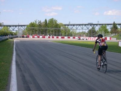 On reprend la route en direction du fleuve, vers l’est. Pour moi c’est la piste cyclable de Montréal qui offre la vue la plus spectaculaire. Le passage près des rapides à Lachine est saisissant. Premier quetzal de la journée, contrairement au cycliste haut-perché de ce matin, lui, est presqu’assis par terre. J’imagine que par temps très chaud, la chaleur qui monte de l’asphalte doit être très difficile à endurer. Arrivés à Verdun, on s’enligne vers l’estacade du pont Champlain, le soleil y est radieux. Je me colle à la roue du Baroudeur et nous nous rendons rapidement à un petit chemin de gravier fin qui nous amène au circuit Gilles-Villeneuve. Les gradins temporaires sont déjà bien en place pour le Grand-Prix de Formule 1 de juin. 60 km : deuxième pause.