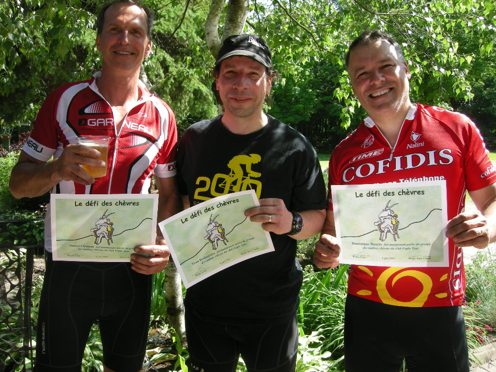 Arrivé en haut avec le Baroudeur, je me joins au petit groupe de tête qui célèbre à grandes gorgées d’eau et de Gatorade.  On félicite avec les High Five de circonstance, l’arrivée de chacun des douze membres du groupe.  Ma récupération se passe rapidement, je suis très fier de ma performance.  Récompense suprême dans les circonstances : notre voiture se trouve au bout d’une longue et vireuse descente.  Finalement c’est  aux poignets qu’on sentira une petite douleur à force d’avoir « pompé » les freins.