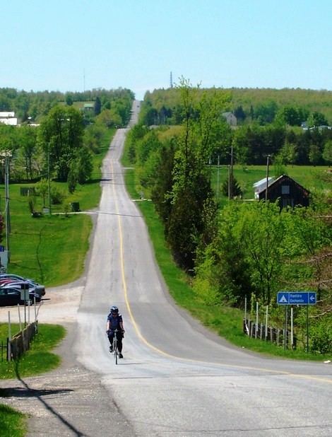 La Tabarnak : Un long, très long ruban gris clair se profile devant nous.  Ce dimanche, nous sommes littéralement au pied de la dernière étape du cours « les Chèvres » visant à améliorer notre performance en circuits ayant beaucoup de dénivelés (extrait du dépliant du club de cyclotourisme Explo Tour)Je ne connaissais pas les informations que je vous présente à l’instant et c’était probablement une bonne chose : la Covey Hill, dans la région d’Hemmingford, est une montée d’environ 2 km qui nous amènera à environ 300 mètres au-dessus de notre point de départ (par comparaison, le Chemin Camilien Houde nous mène sur le Mont-Royal sur 1,5 km à une altitude de 218 m).  L’idée de base est de pouvoir se déplacer dans cette montée avec l’aisance d’une chèvre dans la montagne (je suis toutefois un peu curieux de voir l’aisance de la chèvre lors d’une ascension semblable À VÉLO!!!).  Depuis le matin, nous avons roulé dans les montées et descentes environnantes.  Le moral est au beau fixe, comme la température d’ailleurs.  Le défi est de taille mais probablement à notre portée… et puis, on a quand même payé pour être ici.