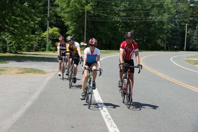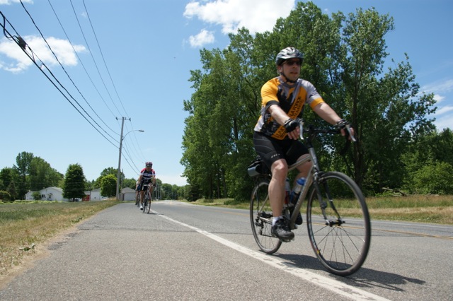 Samedi matin, nous nous rejoignons chez le Chevalier…à Pointe-aux-Trembles évidemment. J’aime ces départs de tôt matin. Tout est plus doux, la lumière, la température même notre rythme. Tel les trois mousquetaires, nous serons quatre aujourd’hui, Sophie, Maître Baril, que nous avons connu lors de la même randonnée, l’année dernière, vient joyeusement bousculer notre groupe masculin. Le Baroudeur, donne ses premiers coups de pédale avec un peu d’appréhension, son dos l’a fait souffrir dans la dernière semaine. 120 km même en terrain plat ça peut être difficile dans ces conditions. Et puis, il faut bien le dire, un petit vent de 15km/h nous accompagnera de côté ou de face sur presque toute la distance, nous aurons l’impression d’être en faux-plat la plupart du temps.
