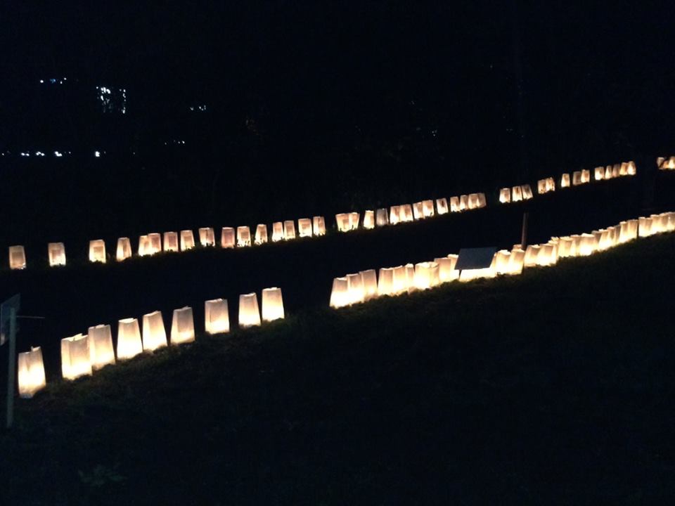 À la sortie, nous sommes accueillis par une bruine un peu froide qui ne ressemble en rien à juin. Nous pensons à Pierre-Luc, le copain de Félix, notre apprenti-politicien, qui a entrepris avec des collègues le relais pour la vie, une « marche » de 12 heures, sur l’Île des Moulins à Terrebonne au profit de la société canadienne du cancer. Sachant très vaguement où nous allons, nous nous dirigeons vers le site de cet autre événement. La température a donné à l’Île un aspect londonien. De nombreux marcheurs progressent sur des chemins balisés par de petites lanternes dans des sacs représentant des proches décédés à cause de cette maudite maladie. C’est un peu cul-cul à dire mais la scène est féérique.