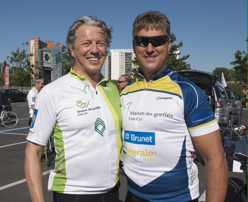 Peut-on imaginer l’émotion ressentie lorsque le coup de fil tant espéré arrive enfin et qu’on nous annonce qu’une nouvelle vie est maintenant possible? Deux des organisateurs et participants du Défi vélo Lina Cyr l’ont ressentie, cette immense émotion: il s’agit de Patrice Dionne, de Québec, greffé du foie et du cœur (à gauche sur la photo) et de Serge Trépanier, de l’Abitibi, greffé du foie.